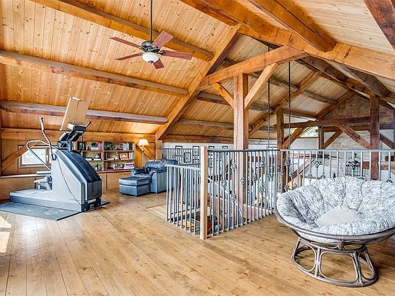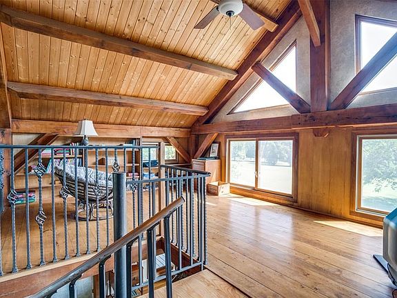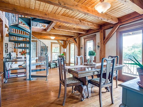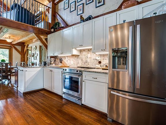 Escape to the country for privacy on 14+ heavily-treed acres with creek close to city conveniences.Charming custom home with a wrap-around porch offers beautiful views from all rooms.Open family room,kitchen,dining area features timber frame construction,vaulted plank ceiling with oak beams,stone fireplace & wood floors throughout. An iron spiral staircase leads to an open loft that makes a great home office. The master suite has 2 walls of windows, glass block shower, double vanity, antique tub, & walk-in closet. 2400 sq. ft. barn features a workshop, storage, parking space & a 1 BR, 1 BA apartment. Don't miss the quaint cabin with kitchen and full bath.It makes a great guest suite, She Shed, or artist studio. 2021-09-17