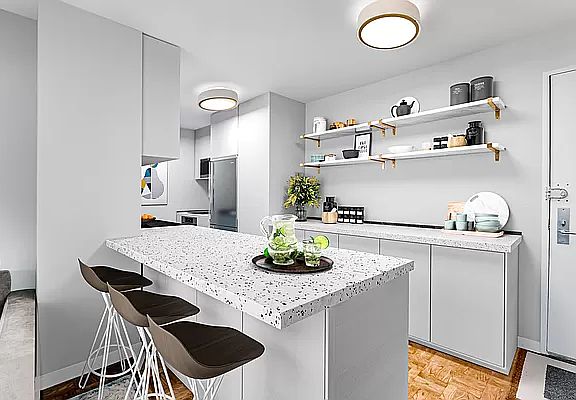Wide-open eastern views are your dramatic backdrop in this serene and spacious alcove studio at Quaker Ridge, one of Gramercy's most respected cooperatives. Perched on the 11th floor, this expansive unit welcomes you home with a wall of east-facing windows that clear the neighboring buildings for breathtaking open-sky outlooks and glorious natural light. Thanks to its position at the rear of the building, the home also enjoys a wonderful sense of peace and privacy. Beautiful hardwood floors invite you to discover a large dining area, perfect as a home office, leading to a spacious living area. Swinging doors open to the kitchen, where you'll find generous cabinet space and stainless steel appliances. The sleeping alcove easily accommodates a queen-size bed, and two roomy closets lead to the full bathroom featuring floor-to-ceiling tile and a large tub/shower. Another spacious closet in the entry and a new HVAC unit complete this impressive studio. Move right into this beautifully positioned unit, or bring your contractor to create your Gramercy dream home by converting the layout to a one-bedroom or opening up the kitchen with a breakfast bar -- two common G line updates. Please note, there is a monthly energy charge of $63 which is included in the maintenance. Quaker Ridge is a classic white brick postwar co-op known for its excellent financials, low monthly maintenance and prime location just steps from Gramercy Park. Residents enjoy full-time doorman service, live-in superintendent, newly updated hallways, laundry, bike storage and a residents-only parking garage with direct access to the building. Quaker Ridge allows co-purchasing and pets but does not permit guarantors or pieds-à-terre. Located just minutes from Union Square, the Flatiron District and NoMad, this home is at the heart of exciting Manhattan living with abundant shops, restaurants, services and outdoor space at every turn. Access to transportation is fantastic with 4/5/6, N/Q/R/W and L trains, excellent bus service and CitiBikes nearby.