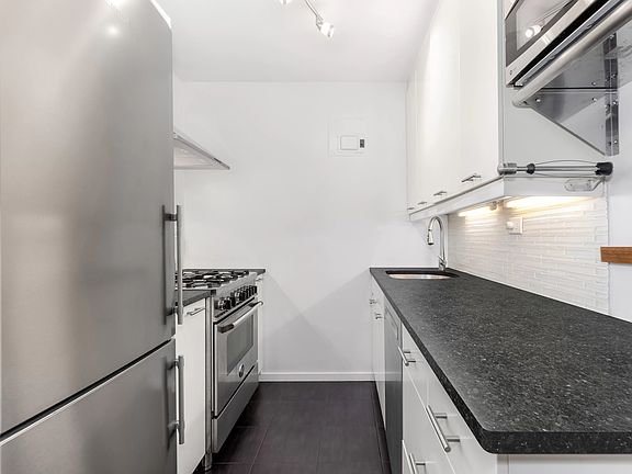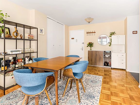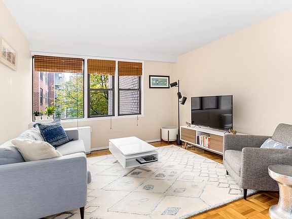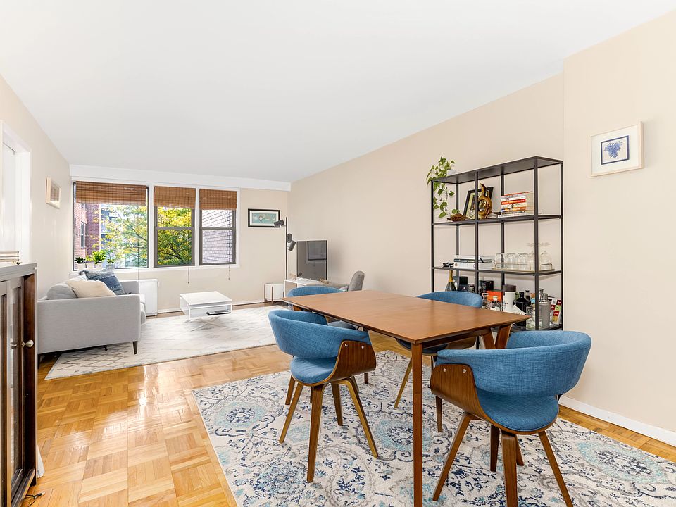 Enjoy serene, sun-splashed surroundings, a gourmet kitchen and an updated bath in this junior one-bedroom, one-bathroom home at Quaker Ridge, an esteemed full-service Gramercy cooperative. This quiet rear unit welcomes you home with a spectacular open-plan living space that stretches nearly 28-feet long to bright east-facing windows. Relax and entertain surrounded by hardwood floors and treetop views, and enjoy plenty of room for spacious dining and home office areas. The renovated open kitchen dazzles with white cabinetry, black quartz counters, glass tile backsplashes and an outstanding stainless steel appliances package, including a Bertazzoni range and hood, a Liebherr refrigerator and a Bosch dishwasher. In the sunny bedroom, you'll find plenty of room for a queen-size bed and dresser. Two spacious California Closets lead to the renovated bathroom finished with gleaming subway tile, a handsome wood vanity and contemporary fixtures. A roomy, custom designed third closet and central HVAC add convenience and comfort to this special Gramercy home. Quaker Ridge is a classic white brick postwar co-op known for its excellent financials, low monthly maintenance and a prime location just steps from Gramercy Park. Residents enjoy full-time doorman service, live-in superintendent, brand new hallways, laundry, bike storage and a residents-only parking garage with direct access to the building. Quaker Ridge allows co-purchasing and pets but does not permit guarantors or pieds-à-terre. Please note, a monthly energy charge of $85.26 which adjusts quarterly is included in the maintenance. There is currently a monthly assessment of $41.38 through the end of 2022. Set in the heart of Gramercy -- with immediate access to the Flatiron District, NoMad, Union Square and the East Village -- fantastic shopping, dining and nightlife are all within easy reach. Enjoy close proximity to multiple supermarkets such as Trader Joe's and Whole Foods plus Union Square and Madison Square Park offer outdoor space, phenomenal greenmarkets and year-round events. Finally, transportation is superb with 4/5/6, N/Q/R/W and L trains all nearby.