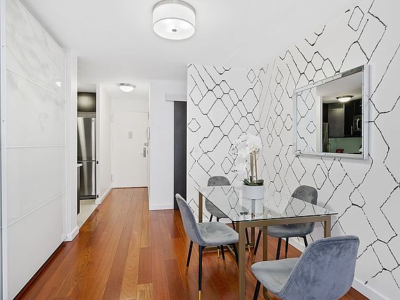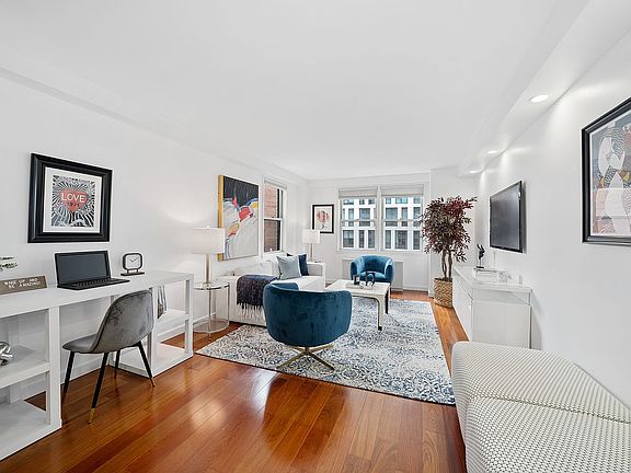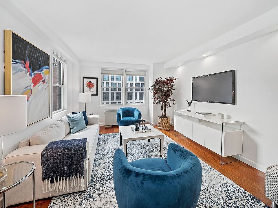 This renovated one-bedroom, one-bathroom home shines with thoughtful contemporary interiors and fantastic natural light in Gramercy Park’s prized Quaker Ridge cooperative. This welcoming home makes an instant impression with new hardwood floors and an open layout that stretches 30 feet to southern and western windows trimmed with custom blinds. The generous footprint allows for separating the space into a living area featuring new recessed LED lighting, work space, and dining area. The kitchen is designed with dark cabinetry, quartz counters and stainless steel appliances, including a gas range and built-in microwave. A space-saving sliding door reveals an expanded bathroom featuring a large tub with shower, pedestal sink, contemporary fixtures and floor-to-ceiling tile. Another sliding door opens to a large bedroom that offers plenty of room for a king-size bed and additional furnishings under custom lighting. This move-in ready Gramercy haven has large deep closets with custom-built shelving in both the bedroom and living room. Quaker Ridge is a classic white brick postwar co-op known for its excellent financials, low monthly maintenance and a prime location just steps from Gramercy Park. Residents of the pet-friendly building enjoy 24-hour doorman service, a live-in superintendent, porters, and laundry plus the building has extra storage, bike rack, and a resident-only parking garage upon availability. Quaker Ridge allows co-purchasing, gifting and up to 75% financing but does not allow pied-a-terres. There is a monthly energy charge of $119.08 which adjusts quarterly.
