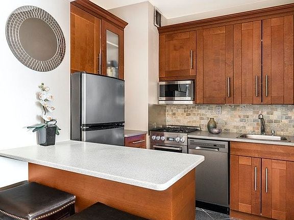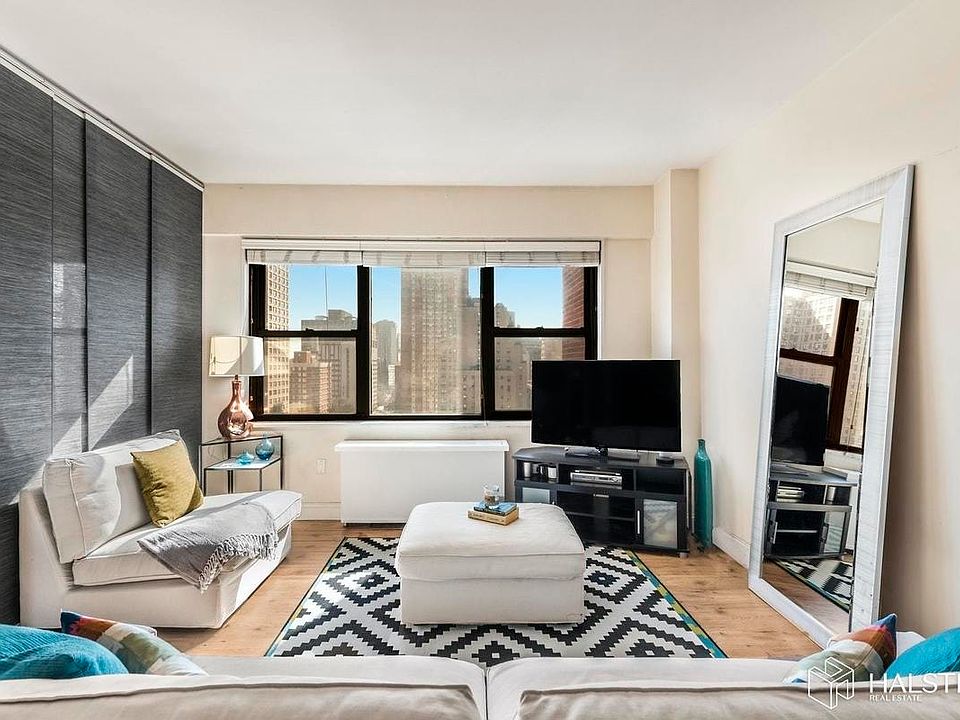 Enter onto the coveted 15th floor with its extra ceiling height and to a beautifully updated super bright and well appointed alcove studio. With an open kitchen and brand new stainless steel appliances, abundant storage and a sizable breakfast bar, you can cook to your hearts content. The open flow Spacious dining and living room face East with gorgeous unobstructed city views and brilliant light all day long. The alcove easily fits a queen size bed and dresser and can be converse to a 1 bedroom without much effort. Other K-lines in the building have done just that! Enjoy an amazing fully built-out walk in closet rarely found in apartments of this size. The bathroom can be accessed through the main rooms rather than the bedroom so you can maintain your privacy. This very comfortable home is extremely well laid out with every area well designated and nothing cramped at all. The HVAC units have all been replaced and the windows are slated to be next. The washer and dryer is on the floor right next to the unit! The Peter James is a lovely well-run coop with a stunning landscaped roof deck with unobstructed views of Empire State and Chrysler Buildings, 24-hour doorman, live-in super, new heating/air conditioning system, private garage, laundry and state-of-the-art lobby & security system. Centrally located to some of the city's best restaurants, entertainment, and shopping as well as downtowns most coveted Madison Square Park and Gramercy Park. Convenient to the 6, N, and R subway lines.