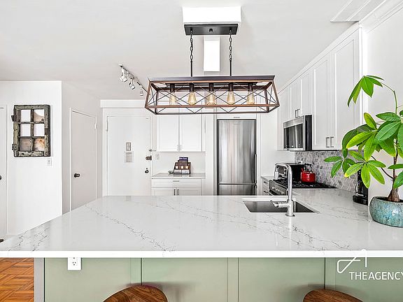 As you enter 9G, you’re greeted by a comfortably apportioned entry foyer featuring a generously sized coat closet offering ample storage space. The beautifully renovated open-concept kitchen features sleek stainless steel appliances including a gas range, dishwasher, and built-in microwave. The kitchen offers plentiful countertop space finished out with gorgeous and modern Quartz counters, all illuminated with tasteful, contemporary lighting fixtures. The peninsula is the focal point of the room, which could double as a breakfast bar or convenient work-from-home space.