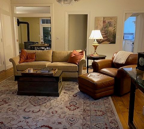 Country Farmhouse with 3 bedrooms, 2 full baths and a large sunny kitchen. HW Pine floors, high ceilings, wood burning stove and first floor laundry/mudroom. The finished third floor can be used as an office, den, playroom or guest area. The Farmhouse's highlight is the spacious kitchen with granite counters, stainless appliances (including a Chef's Thermador gas range). Cozy covered porch and backyard patio overlooking the 3 car Barn/Garage. Inquire about storage in the Barn. Owner/agent
