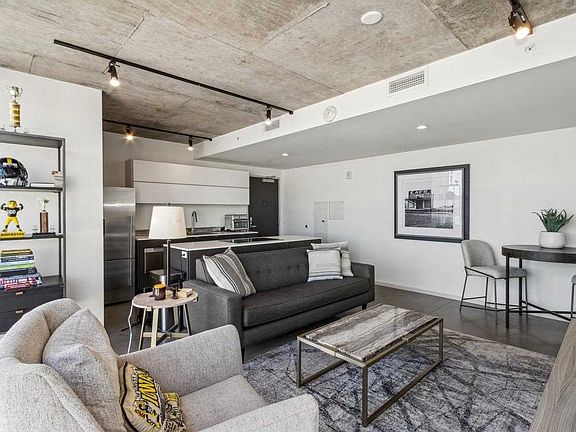 This contemporary 7th-floor condo in Park@201 offers a modern living experience in the center of downtown Iowa City. The main living area features an open floor plan and floor-to-ceiling windows, providing stunning views of the historic Hotel Jefferson and cityscape. The kitchen is both stylish and functional, equipped with custom cabinetry, stainless steel appliances, an island, and sleek Corian countertops. The spacious bedroom includes a sophisticated built-in closet system and direct access to the balcony. The large bathroom is outfitted with a tiled rain shower and contemporary fixtures. Residents enjoy a hip lobby and two building elevators.