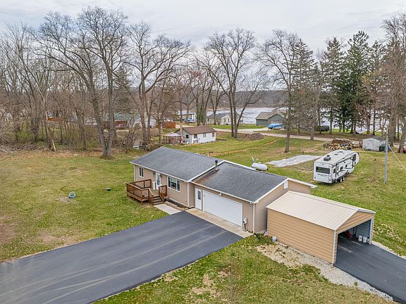 Amazing value and price of ownership for this ranch home sitting on near an acre with LAKE VIEWS of Upper Fish Lake and 4.5 car total garage spaces! This ranch home is in move in ready condition, featuring 2 bedrooms, 1 bathroom, 1120 Square Feet, 0.87 acres of land, Lake Views, 2.5 car HEATED attached garage, and a 2 car size detached garaged for boat storage. The main living area offers an open concept, leading to the kitchen with REAL WOOD cabinetry, NEW APPLIANCES, reverse osmosis water, and more. There are two bedrooms, a full hall bathroom, and a finished laundry room. Off the back of the garage is a large patio space. Other features of this home include a front porch, heated attached garage, large patio, spacious yard, lake views, new propane tank, and much more. Seller also already has approval from town/county for a privacy fence.