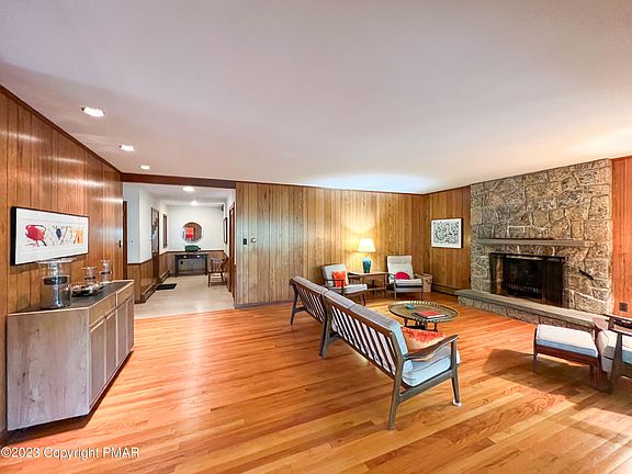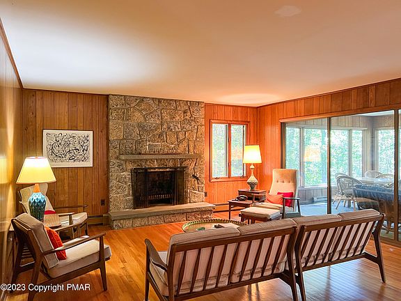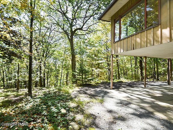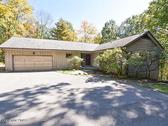 Beautiful mid-century modern ranch home with 2-car garage. This spacious and open home features a large living room with wood-burning stone fireplace, retro kitchen, 3 spacious bedrooms and 2 full baths on the main level. Also, on the main level is a huge enclosed and heated porch/sunroom with lots of windows and an open deck. There are lovely views of the surrounding woods as well as seasonal mountain views. The lower level, walk-out basement offers more living space with two large rooms for office, family room, workout room, etc plus another full bath and laundry. There is also a huge unfinished basement area with loads of storage and workshop. All this on 1.6 acres at the end of a cul-de-sac offering great privacy within amenity-filled Buck Hill Falls.