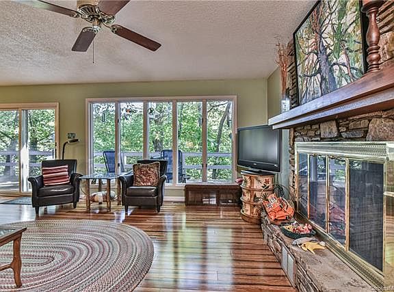 This beautiful home is tucked into the woods above the 13th hole of the Black Mountain Golf Course! A canopy of trees surrounds the large deck and generous living room windows highlight the golf course view and mountains. This .53 acre lot is wooded with no grass to mow! Incredible large garage workshop space with cabinets, counters, 4'X8' central work table and sink, overhead lighting and windows. Great interior flow to main level with open floor plan, large living area and kitchen, newer cork and bamboo flooring, stone fireplace, 2 bedrooms and 3 full baths. The lower level provides extensive space including additional bedroom and full bath. Large open room used as music room with grand piano with small choir rehearsal space and fireplace. Or, use this great space for multi-family living with separate entrance. There is a covered patio off the open area with wooded view. 576' area under garage for storage. This private location is minutes to Black Mountain shopping and restaurants.