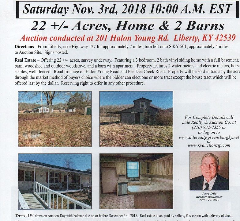 Don't miss this opportunity to own this beautiful farm and home in Casey County! 3 bedroom, 2 bathroom, wood floors, beautiful kitchen cabinets, outdoor wood stove, large covered front porch, screened back porch and partial basement. This 23 M/L acre farm boasts large older barn, metal barn with apartment upstairs and separate water and electric meters, horse stable and multiple outbuildings. Plenty of road frontage on Halon Young and Pee Dee Creek Rd. Pasture land and creek frontage on Pee Dee Creek.