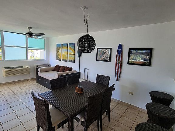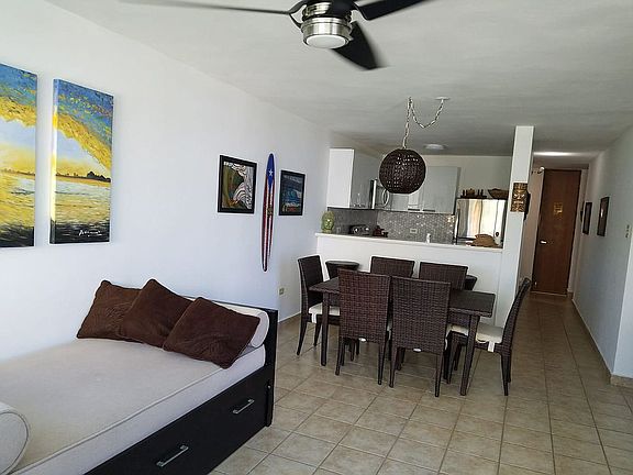 Beautiful beach apartment in Jobos, Isabela. Second floor, living, family, dining, kitchen, huge balcony, big master with private bathroom and balcony exit, two other bedrooms, another full bathroom, lots of closets. Private security, pool, beach exit, two parkings. Complex accepts Airbnb and other rentals.