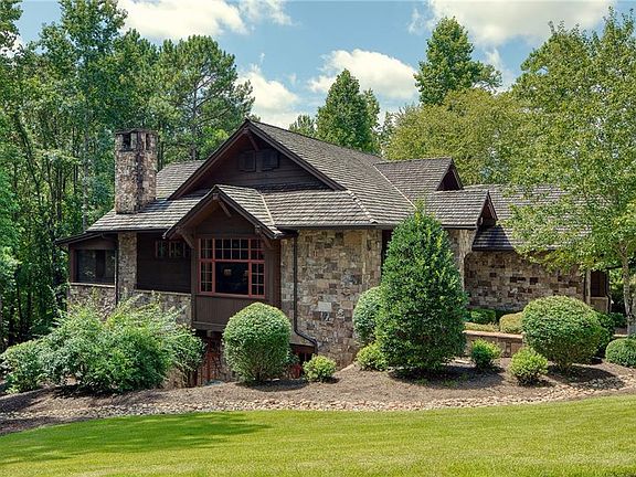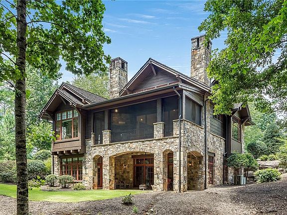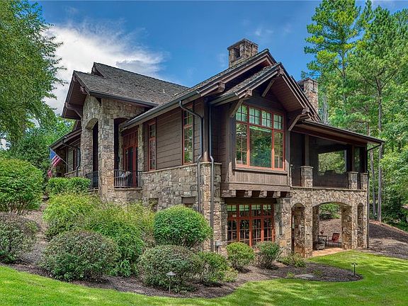 This impressive, well priced home exudes quality and boasts a truly open floor plan with defined spaces. The gourmet kitchen enjoys a 13' ceiling, large window overlooking a courtyard and sizeable granite island separating the kitchen from the Great Room. High end appliances, custom cabinetry and plentiful storage round out the cooks delight. As you move into the Dining Area and Great Room the ceiling changes to vaulted, complementing the full height corner stone fireplace. The open plan in this area provides numerous options for furniture placement. And sliding pocket doors which fully disappear into the wall expand the Great Room to include the screened porch when desired. The Phantom screens, wood-burning and gas stone fireplace and summer kitchen make this porch the perfect spot to sit back and enjoy nature and welcome company. The Owner's Suite is accessed a recessed alcove off the Great Room and enjoys a vaulted ceiling, large windows and direct access to the screened porch. Heavy double pocket doors lead to a sumptuous bathroom with claw foot tub, walk in shower, double sinks and large closet. A delightful feature is the private covered porch accessed via sliding doors. A cozy retreat hidden from site or possibly a hot tub location, the choice is yours. The lower level provides solace for guests with two well-spaced suites, one currently configured as an 8 bed bunk room but easily transformed to a spacious suite. The staircase to the lower level is an inviting 4' wide and opens up even wider as you descend to the Recreation/Game Room. This huge light filled room opens to a covered flagstone patio and the yard beyond. Two 4'wide sliding panels invite the outside in. Gracefully curved stone arches frame the patio and its view of nature. The majority of the exterior is stone with hewn wood accents lending a mountain/ lake appeal while the interior with its vaulted ceilings, exposed beam accents and hardwood floors enjoy awesome natural light from the abundant windows. This fee based low-maintenance home sits perfectly on a beautifully landscaped homesite in the Falls Creek neighborhood within Falls South. Jump on the walking trail just down the street or stroll to Waterfall Park and enjoy a picnic or just hanging around at the top of the falls. A state of the art wellness center, variety of fitness classes and a gorgeous heated swimming pool and tennis/pickleball courts are also a short ride away. Just above the amenity complex is a wonderful gazebo boasting a water feature and a fireplace, one more option for entertaining or just meeting up with friends. A leased boat slip is available for transfer with the property and is located a short golf cart ride away.