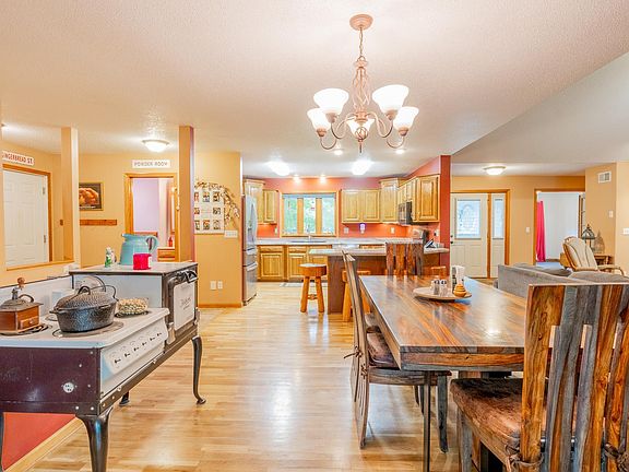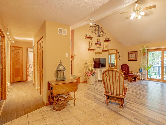 Looking for country living close to Bemidji MN? You have landed at the right spot, welcome to Country Lane Estates. This 3000 + sq ft 4/5 bedroom 4 bath home rests on a private 1.9 acre fenced corner lot with apple trees and plenty of other hardwoods. The main floor has an open floor plan, large living room, vaulted ceilings, electric fireplace, dining room, and kitchen with a large walk-in pantry all tied together with lvt and hardwood floors. Your main floor primary bedroom greets you with vaulted ceilings, double sinks, and a walk-in shower. Also the main floor of the home has 2 more bedrooms and or office space. Another 3/4 bath with a zero entry custom tile shower, main floor laundry, ½ bath and a large mudroom right off the heated and finished garage. You will find 2 more large bedrooms in the basement, a 2nd rec room, plenty of storage in the utility room. Enjoy the mowed trails, fenced gardens, privacy fencing, a chain link fence in the backyard, front & rear covered decks!!