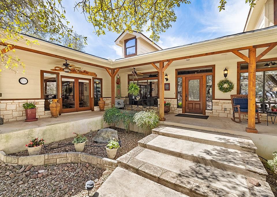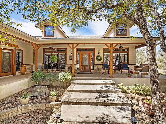 Stunning stone fireplaceWraparound porchHill country viewsExpansive windowsBonus roomFull kitchenCovered patio