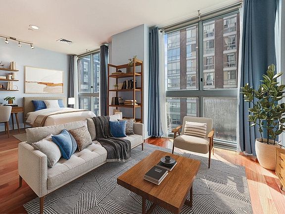 Experience vibrant downtown living in this spacious, sun-drenched studio at Gull's Cove, a full-service, amenity-packed building right on the Light Rail in Jersey City! With nearly 600 sqft, this south-facing unit boasts floor-to-ceiling windows, an updated full-size kitchen, in-unit washer/dryer, and central AC/heating. Thoughtful touches include energy-efficient LED lighting, stylish designer pendant lights, and 3 oversized closets. Recent upgrades include a dishwasher and HVAC system. Gull's Cove offers 24-hour concierge, a gym, yoga/pilates studio, bowling alley, kid's playroom, two chic lounges, and an outdoor golf putting green. Just steps from shops, cafes, and the lively Grove St. Path & Newark Ave. Restaurant Row, plus a serene stroll to Paulus Hook's charming waterfront and Ferry access. Control your own utilities and save with a price 3% below market! A must-see gem schedule a tour today! 2 photo images have been AI enhanced to show floor plan utility.