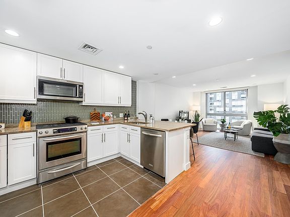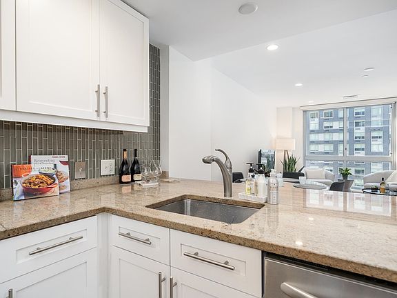 Soak up the sunlight in this beautifully maintained, spacious south-facing one-bedroom home. Highlights include floor-to-ceiling windows, an open gourmet chef's kitchen with gas cooking, stainless steel KitchenAid appliances, ample cabinetry with task lighting, a custom glass tile backsplash, and refinished wood floors. The home also features porcelain-tiled floors, a king-sized bedroom, a custom walk-in closet, central AC, and an in-unit washer/dryer. Conveniently located with the Light Rail at your doorstep, PATH just five blocks away, and a ferry stop to Wall Street nearby, commuting is a breeze. Residents can also enjoy the club room, featuring a Peloton, lounge with a fireplace, children’s playroom, shuffleboard, and a bowling alley.