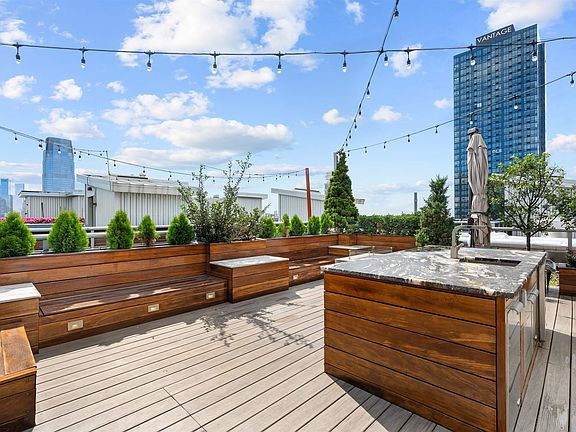 A rare offering! A Pristine Penthouse w/ an unbelievable 600 sq ft private rooftop deck featuring Panoramic views. Welcome yourself to this north-facing home w/ excellent split layout & 11-foot ceiling height. Every part of the unit has been upgraded in some capacity – wainscoting along the walls, smart LED lighting & digital switches/dimmers installed, motorized shades, a water filtration & softening system installed, a smart washer & dryer controlled from an app, a wine refrigerator, a smart water irrigation system for the rooftop plants, a water pump installed, smart smoke detectors + a built in home office. Enjoy entertaining from your own private oasis rooftop deck which features custom built Brazilian Teak seating, limestone end tables, granite island, a gas fire pit, overhead lighting, outdoor speakers & a dining area! A commuter's dream with the Light Rail at your doorstep, Grove PATH just 5 blocks away & a ferry to Wall Street all within close proximity. The building amenities include a fitness center, game room w/ bowling alley, a children's playroom, a club room w/ Peloton bikes + much more! This home is located in the Cornelia F. Bradford No. 16 Elementary School Zone! One garage parking space is available for an additional $40k.