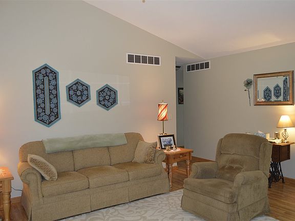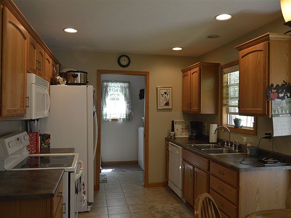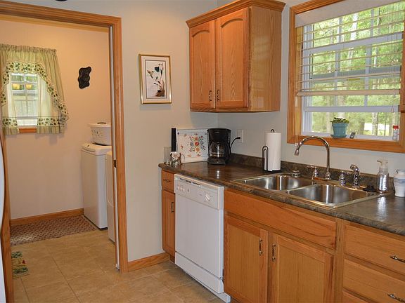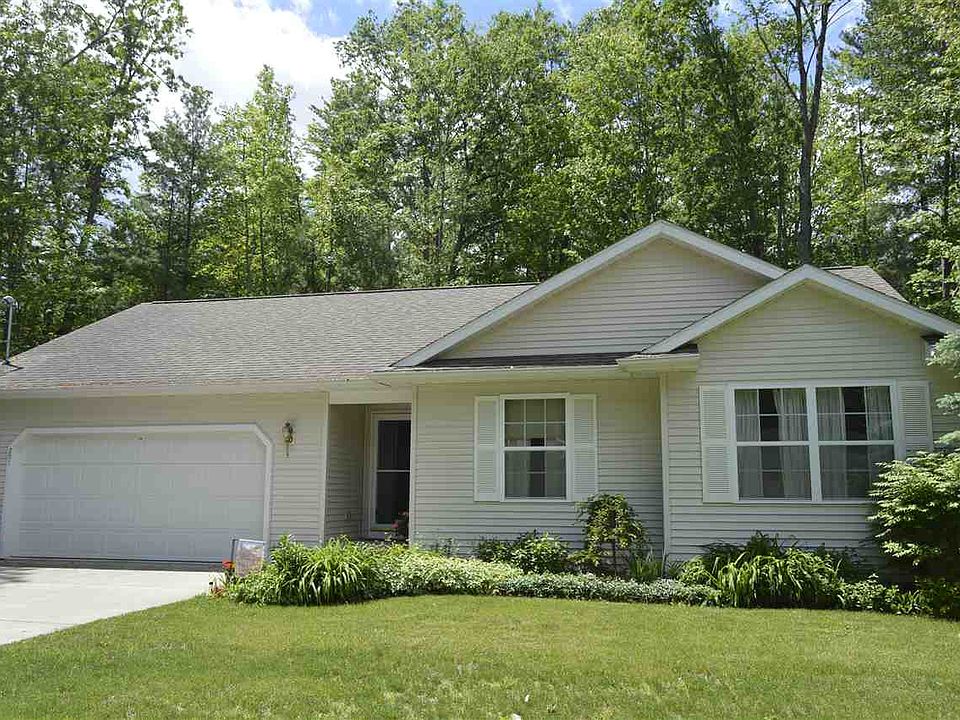 Snuggled in trees and beautiful landscaped this 3 bedroom 2 bath ranch home is within walking distance to lake access and in a peaceful wooded setting. Located close to town but a very quiet setting. Features master bedroom with private bath, two other good sized bedrooms and another full bath. Cathedral ceilings in living area with door wall to deck, oak cabinetry in kitchen with laundry off of kitchen by garage. Attached two car garage and paved drive. Large extra lot is included in the price! Also has hook up on side of garage for a camper. Don't miss this one!!
