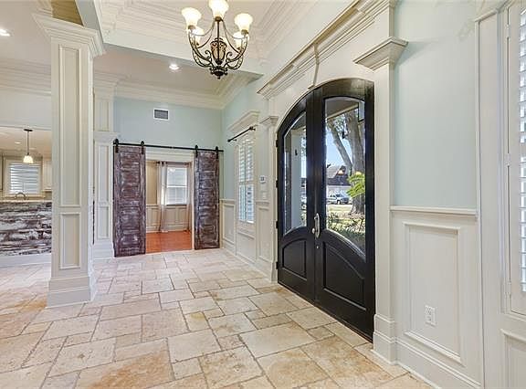 Fall in love with this stunning home! Luxurious crown molding, elegant columns & wainscoting throughout. Custom built ins, wood accents, barn doors & tray ceilings. Brand new upstairs & master bathroom. Oversized lot with with a covered patio & rear alley access. Stamped concreted circle driveway with beautiful landscaping & sprinkler system with automatic timer. X flood zone. Whole home generator. A must see!