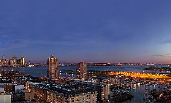 11th floor SouthEast corner unit with panoramic downtown NYC, River & Statue Views. This sunny unit features a home-like floor plan with separation of bedrooms & living space, allowing for private entertainment in one atmosphere while relaxing in another. Gourmet kitchen features granite counters, mahogany cabinetry & breakfast bar. Add 2 large marble baths, gleaming hardwood, laundry in unit, central air & proximity to PATH/Light Rail/Ferry & this is perfect!