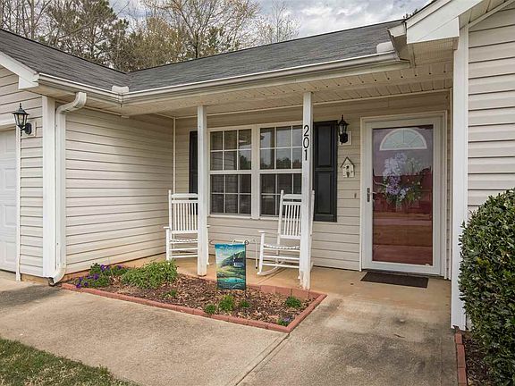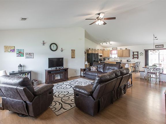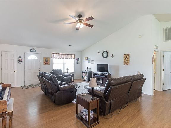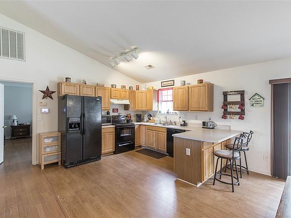 What a gem! This wonderful vinyl ranch is situation on a level +/-.23 acre level lot and has picture perfect curb appeal thanks to the front entry double Garage, covered rocking chair front porch, and low maintenance landscaping. A sought-after open floorplan awaits you inside along with a cathedral ceiling and luxury laminate flooring that decorate the main living areas. There's plenty of space for easy everyday living in the large Great Room along with double windows that overlook the pretty front yard. The Great Room transitions seamlessly into the Kitchen where you will be pleased to find a bank of honey toned cabinetry, plentiful workspace, and full black appliance package. Pendant style lighting punctuates the adjoining Dining Area where a sliding glass door provides easy access to the rear patio. The bedrooms are arranged in the preferred "split plan," which allows for maximum privacy. All of the bedrooms have been styled with soft carpet and great closet space. The Master has its own ensuite bath while the secondary bedrooms share an easy to reach hall bath that features a tub/shower combination, cultured marble vanity, and easy to clean vinyl flooring. Also, be sure not to miss the Laundry Room that's already equipped with a washer & dryer!