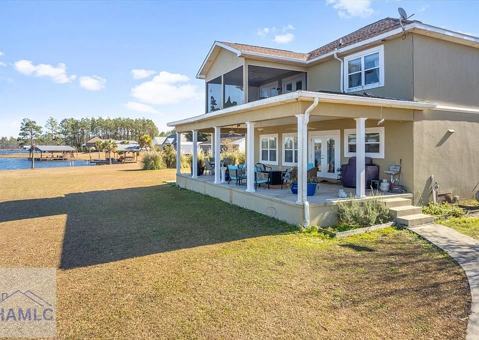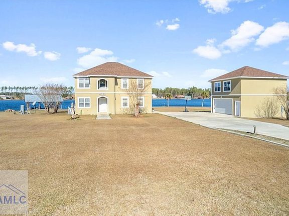 Welcome to lakeside living in the gated community of Miles Landing, where this beautifully updated two-story home enjoys panoramic views of the private 110-acre Lake Henry Grady. Set on two spacious lots, the property includes a fully fenced garden space—ideal for homesteading, recreation, or simply enjoying the peaceful setting. The home features a one-year-old architectural shingle roof, energy-efficient spray foam insulation, and two HVAC systems. Inside, the open floor plan invites you into a newly remodeled kitchen with updated cabinetry, a gas stove, two pantries, and a breakfast bar that opens to the dining area. French doors just off the kitchen and dining space lead to a spacious patio—perfect for grilling, entertaining, or relaxing outdoors. Recessed lighting and modern ceiling fans have been added throughout for a fresh and functional feel. Downstairs also includes a flexible bedroom or office space and a full bathroom with a walk-in shower. The attached garage has been transformed into a sunken sunroom, complete with a second refrigerator and a custom barn-door enclosure for the water softener system and hidden storage. Upstairs, you'll find four spacious bedrooms, including the luxurious primary suite with a private screened balcony overlooking the lake—an ideal space for peaceful mornings. The primary suite features a thoughtfully designed layout with a large bathroom separating the bedroom from the custom walk-in closet, which includes a dedicated vanity area. The laundry room is also located upstairs with access to attic storage. The detached garage adds even more value, with a dedicated workout area and workspace on the lower level, and a 672-square-foot guest suite above. The suite includes a kitchenette, full bath, and beautiful lake views—perfect for guests, hobbies, or multigenerational living. A 40x40 dock sits at the water's edge, providing space for your boat and jet skis, and completing the lakefront experience. The property is equipped with underground irrigation and high-speed fiber optic internet for modern convenience. Located just 18 miles from Jesup and 23 miles from Baxley, this one-of-a-kind lakeside retreat offers privacy, functionality, and natural beauty. Schedule your private showing today.