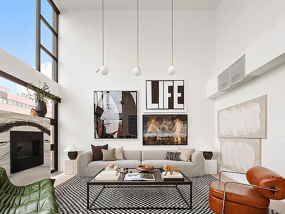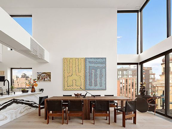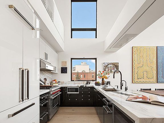 Residence 3 at 201 North 11th Street is an unparalleled four bedroom, two and a half bath duplex that occupies the entire fifth and sixth floors in a boutique condominium building in premier Williamsburg. Spanning over 2,100 interior square feet, this spectacular residence boasts four outdoor spaces including three sizable balconies and a phenomenal private rooftop, exceptional views of the city, McCarren Park and the iconic Russian Orthodox Cathedral. A keyed elevator opens directly to a gracious foyer with its beautifully detailed reclaimed wood walls and a white oak staircase. The dramatic centerpiece of this home is the awe-inspiring north and west facing great room with soaring 18’ ceiling heights and a marble clad gas fireplace. This extraordinary space offers protected views of McCarren Park's lush treetops and the architecturally stunning Russian Orthodox Cathedral, which has been designated as a NYC Landmark and is listed on the National Register of Historic Places. A sliding door leads to a balcony off the great room creating the perfect vantage point to savor these unbelievable views. The renovated chef’s kitchen boasts custom millwork and a massive waterfall breakfast bar/counter with bookmatched Lasa Macchia Vecchia black and white honed marble. A suite of top of the line appliances include a 36” Wolf Professional six-gas-burner range with vented Viking hood, 36” Miele french door refrigerator with double freezer, Miele dishwasher, deep sink with black matte Graff fixtures, integrated microwave, and Miele under counter wine refrigerator. The kitchen’s west facing picture window overlooks the cathedral’s gardens. On the southern end of this level lies two generously proportioned bedrooms - one of which presently serves as a home office with its own private terrace. Also on this level is a chic colorful powder room and an additional full bathroom adorned with terrazzo tile floors, teak wood walls, dual Duravit sinks, a Toto commode, and stylish Brizo fixtures. The hallway provides ample storage and houses a full-size Whirlpool Duet washer and vented dryer. A white oak staircase leads to the second level where there are two generously sized bedrooms. The sumptuous primary suite faces south and west, bathing the space in sunlight through expansive floor-to-ceiling windows that open onto a private terrace. The five-piece windowed bathroom boasts dual Duravit sinks, a glass-enclosed rainfall shower with a peekaboo window offering views of the cathedral and McCarren Park, a Neptune deep soaking tub, and heated floors and towel racks. The keyed elevator leads to the show stopping 475 SF private rooftop providing the perfect oasis from city living and presents panoramas of McCarren Park, the iconic cathedral, and the majestic Manhattan skyline. Crafted for unparalleled entertainment, this outdoor haven boasts a fully equipped stainless steel outdoor kitchen. Other noteworthy features include brand-new European white oak 10” wide planks floors throughout, seamlessly integrated recessed lighting, video intercom virtual doorman system via smartphone, and split air conditioning system and classic radiator heat. 201 N. 11th Street is comprised of only four homes in this boutique condominium building. It is located just one short block from the 35 acre McCarren Park which boasts incredible green spaces, an outdoor swimming pool, running track, tennis courts, skate park, dog park, a green market and more. Williamsburg offers incredible restaurants, shopping and easy public transportation all close by, including the Bedford L train, the waterfront, the Apple Store, Equinox, Trader Joe’s, and Whole Foods Market. There is currently a 421-A tax abatement that ends in 2027.