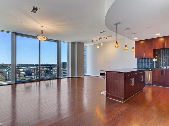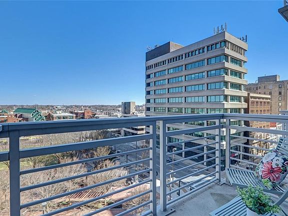 Sophisticated luxury condominium on the 5th floor of the Center Pointe complex! Most spacious 2 bedroom plan! High ceilings and floor-to-ceiling panoramic views elevate the living experience of downtown life. The open kitchen with eat-in island, tile backsplash, and custom cabinetry flows into the spacious living/dining area with hardwoods. Private balconies enjoy beautiful urban views of Lebauer and Center City Parks. Primary bedroom is complete with bright natural light and a deluxe bath with a walk-in shower and double vanity. Enjoy elite building amenities including 24/7 security with around the clock secure building access, a covered parking garage, private fitness facility, concierge, and restaurant. Immediate proximity to the new Tanger Center for the Performing Arts, LeBauer Park and Center City Park!