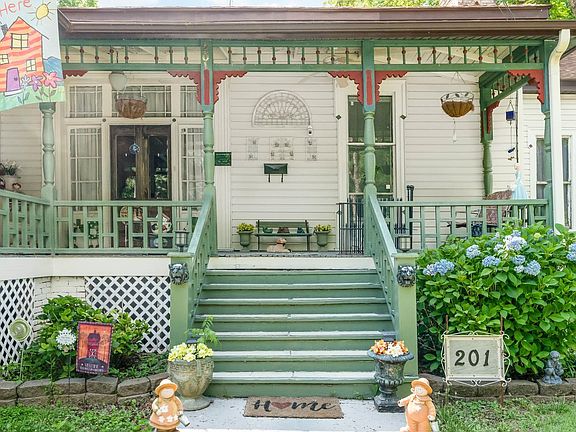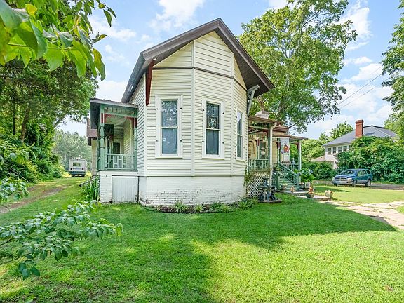Quaint Victorian remodeled and added onto through the years and retains many of the Queen Anne Anne Features.Spindle work on porches,light fixtures, original moldings, heartwood pine floors and windows. Pocket windows in the parlor. Plaster walls remain in original part of home. Rocking chair front porch. Modern features include updated kitchen and laundry, 200 amp electrical, plumbing and added insulation. LVP in kitchen, newer roof with ridge vent. Original cedar siding is retained under vinyl. 1080 sf detached garage. Shed does not convey.