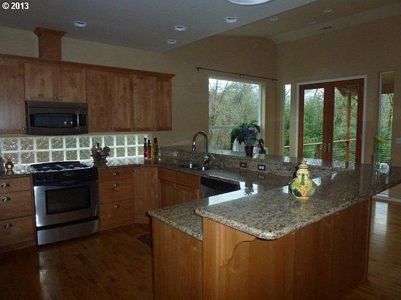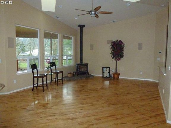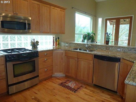 This wonderful custom home is secluded w/N Myrtle Creek swimming hole frontage.4BR,3BA 2288 sqft w/open floor plan, Maple & Hickory floors, granite, eat bar, skylites, lg gourmet kit, lg windows, cool glass block, mstr suite w/huge shower & private deck, lg rec rm, lg laundry rm w/grdn window, cvrd deck for entertaining, nice views of lg open yard Must see today,priced to sell.