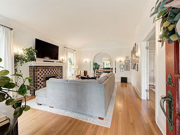 The home showcases newly refinished wood floors throughout the main level and a kitchen that has been completely upgraded with new cabinets, countertops, state-of-the-art appliances, and a chic backsplash. The interior is adorned with elegant archways and antique details, enhanced by stylish brass and black accents, creating a rich, inviting atmosphere.
