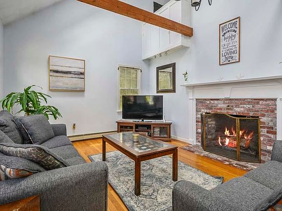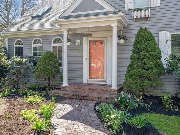 Spacious Contemporary Cape set back on an acre of beautifully landscaped grounds. This charming home features a large first floor primary with private bath and spa tub. The open concept layout presents soaring ceilings, wood burning fireplace and substantial natural light. The large, airy kitchen is complete with new flooring, stainless appliances, oversized island, gas stove, double oven, pantry, extensive cabinet space, new fixtures, and a retractable cutting board. 2 of the 3.5 bathrooms have been fully remodeled in recent years. Upstairs, you'll find new flooring throughout, plus 3 more spacious bedrooms, one of which is a secondary bedroom with yet another large, en suite bath and Juliet balcony. The finished, walkout basement boasts another fireplace, full bathroom, bar area, plenty of additional storage and is ideal for entertainment or guest quarters. Outside you will discover a plethora of established trees, shrubs, and flowers, raised beds perfect for home grown veggies, an oversized deck, outdoor shower, firepit area, and 2 gardening sheds. The ideal place to call ''Home''