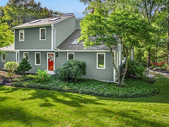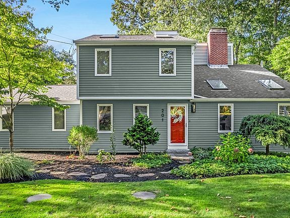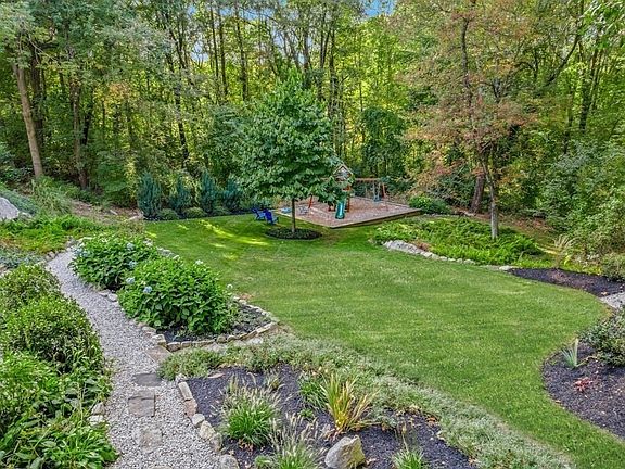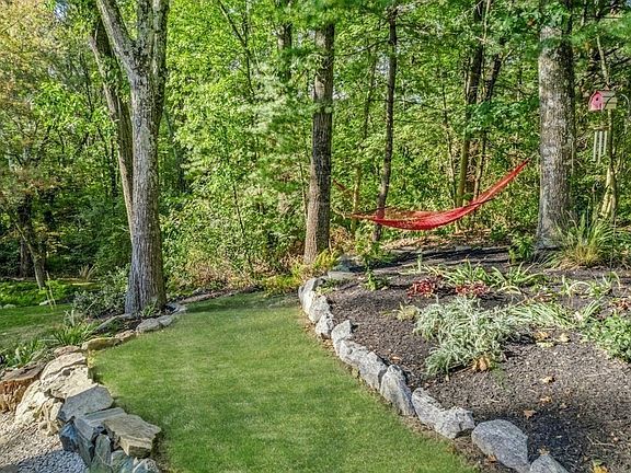 Situated on a private acre, this custom contemporary home welcomes you with soaring ceilings and walls of glass that fill the vaulted family room with natural light. A dramatic floor-to-ceiling fireplace creates a warm centerpiece, while the dining room opens to an expansive composite deck overlooking the backyard. The kitchen is bright and airy with vaulted ceilings, skylights, granite counters, stainless steel appliances, and a large center island. A first-floor bedroom and full bath offers versatility for guests or extended family. Upstairs, the primary suite is a retreat with cathedral ceilings, exposed beams, skylights, and a spa-like bath with double sinks and a beautifully tiled shower. Another spacious bedroom enjoys its own private balcony. The walk-out lower level features a wall of windows, slider access to the yard, and a cozy wood stove. Outside, meandering walkways, lush landscaping, and multiple gathering areas make the backyard a true private retreat.