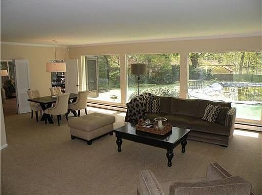 This expansive Ranch style home features large open sophisticated spaces with lots of light. The large sunken LR/DR with brick FP is the highlight of this mid century design and overlooks the newly renovated inground swimming pool through large plate glass windows. The large kitchen boasts a center island with counter seating and a tile floor. A sunroom atrium addition provides a relaxed atmosphere with flexible use and connects the kitchen to the wonderful rear yard. A private den off t...