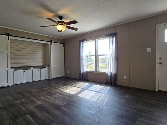 The cozy living room boasts built-in storage with barn-style sliding doors, perfect for keeping things neat while adding farmhouse character. The split floor plan provides privacy, with a large primary suite offering a spa-like bathroom with dual sinks, a soaking tub, and a tiled walk-in shower.