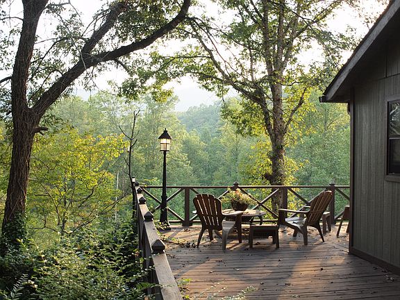 This cute little cabin features a large L shape deck out front with a small sitting deck on the side, a screened in rear porch that leads into a totally remodeled kitchen with Whirlpool Appliances solid wood custom cabinets which leads into a beautiful living/family room with a solid wood vaulted ceiling with wooden beams and window views, hardwood floors. A spiral stair case which leads to a finished basement/office/family room and a separate laundry room. The landscape is perhaps the nicest in the area in this bargain price range.A beautiful peaceful setting, paved road up to the driveway, two tenth of mile from Highway 441, close enough for the convenience yet far enough to not hear traffic sounds. If you like waking up to singing birds, going to sleep with beautiful sunsets, having the security of neighbors around but not in visual sight of them and the comfort of a cozy little cabin that's small enough to heat and cool with a landscape you might expect in a higher end home in Highlands NC, you will love this home!