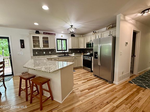 Immaculately kept Cerrone-built ranch on 1.19 acres, featuring 3 bedrooms and 1.5 baths. Enjoy open-concept living with a new updated kitchen, new appliances, and a stunning eat-at granite island with tiled backsplash. The home boasts gleaming hardwood floors, energy-efficient Anderson windows, central AC, and a recently updated bathroom with tiled floors. A bonus partially finished basement with bar (can be used as is or add flooring for finishing touches) provides 800 sq ft of additional space, ample storage, a new water heater (2023), and a new washer and dryer. Step through a new sliding glass door into an expansive backyard with a multi-layered deck, firepit sitting area, koi pond, pergola, and fenced-in space. This property also includes fruit trees and a shed. Open house CANCELED