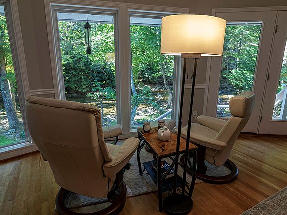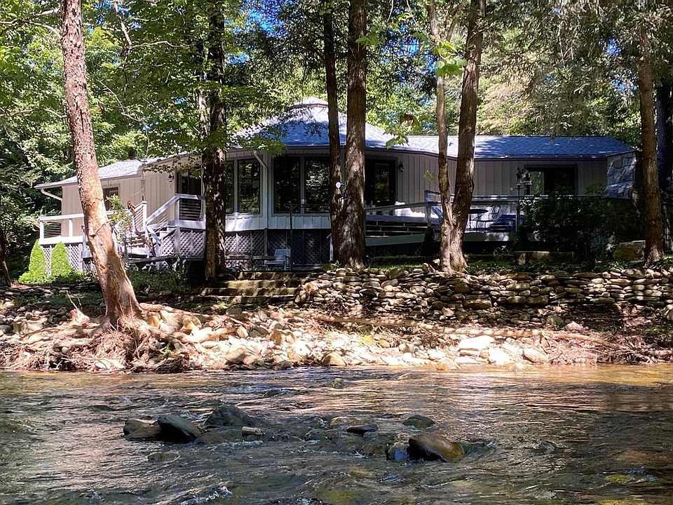Enchanting 3 bedroom, riverfront home just yards from the 15th Green, is a haven for the nature-lover with wild trout fishing from your back yard. Freshly remodeled in 2020 - you'll enjoy professionally-designed kitchen, new bathrooms, all new appliances, and radiant floor heat. Single-level living with handicap access throughout. Quality construction with solid cherry hardwood floors, new quartz surfaces, and tasteful ceramic tile accents. Watch visiting birds, and deer fording the river from your spacious great room featuring expansive river views and cozy stacked-stone gas fireplace. Southern orientation ensures sunny winter exposure - a perfect year-round home. Large, shaded, riverside deck features large outdoor fireplace, perfect for entertaining. In addition to a fully finished garage with heat and & air, there is extra workshop space and golf cart parking. Low POA fees. Close to the Blue Ridge Parkway, national forest, waterfalls, and several restaurants.