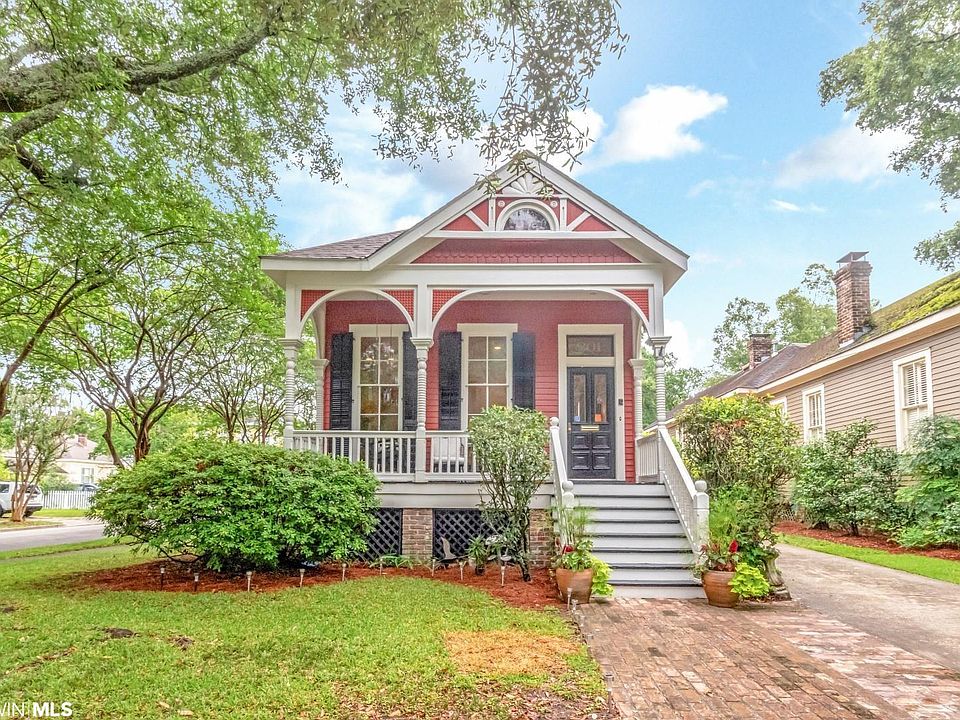 Welcome to Church Street East. A unique Downtown neighborhood walkable to Restaurants, Theaters, The Arts, Breweries, Festivals and Mardi Gras Parades. Historic quaint homes of all sizes. A circa 1893 Victorian Folk Gothic Revival area, rich with details including turned posts embellished with intricate spoon-carvings, flanked by arched brackets that echo & accentuate the tall shuttered jib windows. The facade is accentuated with an asymmetric gable, complete with a quadrant fan window. Designed by the renowned architect, Rudolf Benz who designed many of the historical downtown mansions & commercial buildings that made up the landscape of the downtown in the 1870's thru early 1900's. This home is one of the few smaller homes he built. "Gracefully historical" describes this home. Historical attributes include 7/8" thick heart of pine floors in beautiful condition, 12" wide baseboards (as it should be), the jib windows from the front porch to dining room, 4 working fireplaces - in Dining Room, Living Room, Gathering Room in Kitchen and Primary Bedroom. This is a "Sister House" or twin house to the one next door & both were moved from around the corner. From a Mobile Press Register article (1984) featuring the homes, "they remained structurally sound - built with surprising sturdiness, of oak, cedar and cypress, with 4x4 inch studs, and beams under the house of 1 1/2 foot by 1 1/2 to 2-foot oak and cypress. Each room has wind bracing within the walls, and they've only had to use about 5% new wood in the whole house". 2 nice sized bedrooms and each has their own private bath. Primary bedroom has a walk-in closet & separate bath with soaking tub & separate walk-in shower. Formal Living Room & Dining Room & Kitchen with Gathering Room. A pleasant Sunroom/Office overlooks the garden. Corner lot and ready to move in! Come be a part of the vibrant atmosphere in Church Street East!! **Listing Broker makes no representation to accuracy of square footage. Buyer to verify.**