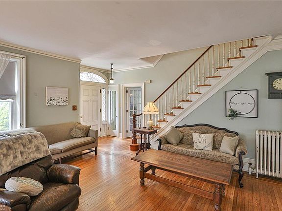 Home is a lovely, unique Victorian.  It sits on over 1/2 an acre corner lot in the Historic District with leaded transoms, gingerbread unique trim over windows and peaked slate roof with patterned slate.  The kitchen was updated offering old European charm with exposed rafters, updated gas stove and alcove, off the kitchen is the plant/mud room that leads to the backyard.  Entrance to home has a presence of elegance abound with a wood fireplace in the living room. Family room and sunroom both have a decorative fireplaces.  1st floor powder room. The second floor offers 3 spacious bedrooms, laundry room and full bath with lots of space.