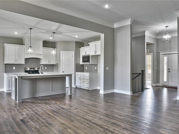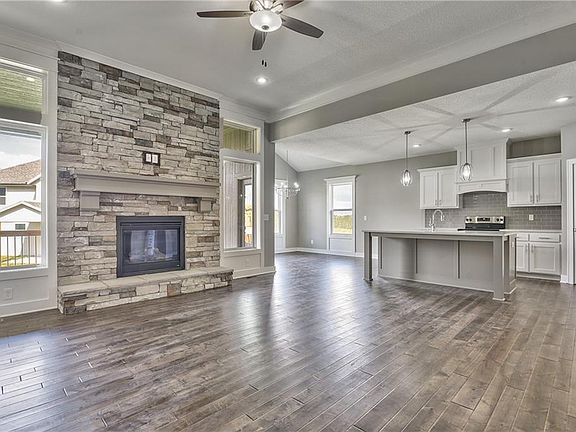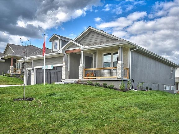 Looking for a reverse 1 1 /2 story home on a walk out lot backing to trees? This is the one! Stunning 4 bedroom, 3 bath, covered deck & 3 car garage by Prieb Homes backing to trees and Lake Olathe property. Beautiful hardwood floors throughout the entry, great room, kitchen and dining area. Spacious great room with fireplace and tons of natural light opens to a cook's kitchen and dining area. Center kitchen island, granite countertops, apron front sink, stainless steel appliances, painted custom cabinets with undercabinet lighting soft close drawers & doors, walk in pantry, hood and built in microwave. Fifth bedroom/study on first floor with an adjacent full bath. Private Owner's suite with vaulted ceiling leads into a lovely bath with double granite vanities, tile floors, large tiled shower, custom cabinets and spacious walk in closet. Laundry room conveniently located off the master bath. The U-shaped staircase takes you down to the lower level featuring a rec room hat walks out to the private backyard. Two more bedrooms and 3/4 bath will complete the lower level finish. With safety in mind this home has a storm room whenever you need to take shelter. Lots of storage, sprinkler system and more. This charming home backs up to the newly renovated Lake Olathe property offering a ton of outdoor activities. Prairie Farms has a large pool, cabana, play aea and walking trails. It's a great place to call home!