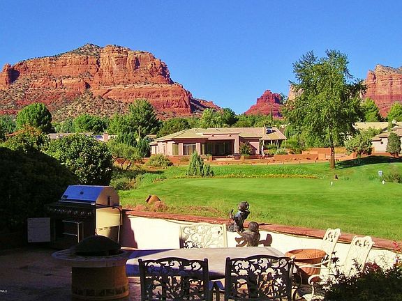 Spectacular golf course property located on the 4th tee of the Sedona Golf Course. This stunning masterpiece enjoys panoramic view of Bell Rock and Lee Mountain in the distance. This custom home boasts two fireplaces, floor to ceiling windows wit amazing views, custom exterior lighting, covered patio, fire pit, built in stereo sound system, knotty Alder custom cabinetry, Steam shower, Jacuzzi tub, double sinks in master with two master closets offering plenty of storage. Beautiful hand crafted doors and woodwork through out the entire home. You must see this beautifully designed custom home to appreciate its location and amenities. Priced under recent appraisal. Potential opportunity to add an additional guest home next to the house facing the golf course without increasing the septic tank!! Call today on this remarkable opportunity.
