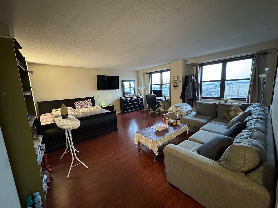 Large Studio Apartment with windows *No broker's fee* Located 4 blocks from Journal Square PATH station. 14 minutes to WTC and under 30 minutes to mid-town 33rd street. Close To All Transportation, Path, Buses, Holland Tunnel and minutes into Downtown Jersey City. The apartment has refrigerator, dishwasher, oven, over-the-range microwave oven in the unit. The building has a full service elevator, 24 hr. doorman with laundry room, fitness center, and an outside swimming pool during the summer months on premise. Rent includes heat, hot water, cooking gas and central A/C. Tenant only pays electricity and internet. Parking, gym and pool available for additional fee Please contact me for a showing. Looking for long term tenant with 1 year lease.
