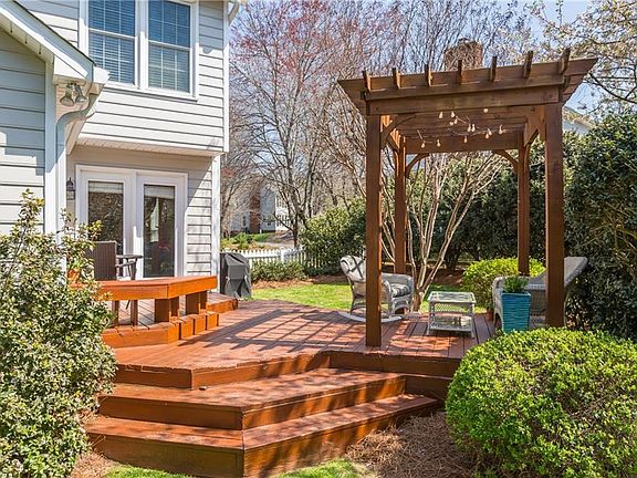 Cut off time for offers will be Thursday April 27th 5:00 pm If you enjoy outdoor entertaining, look no further! no HOA! The yard was designed by a landscape architect and has beautiful, mature plantings that provide lots of privacy. The home features a front court yard, 2 story foyer, formal living room & dining, a separate den with wood burning fire place, granite in the kitchen & all bathrooms, engineered hardwood, vaulted ceilings in primary bedroom, formal living room & kitchen, crown and base moldings throughout, 2 car garage, lush well manicured landscaping, fenced yard that showcases a multi-tiered deck, pergola & fire pit for outdoor entertaining! This immaculate home has been professionally decorated by an interior designer and is move in ready Refrigerator, stove & washer/dryer also remain. Abington also offers a neighborhood pool to join. Seller is Active NC REALTOR. Please send all offers to owner/agent Angela Tackett, angelatackett@cbadvantage.com
