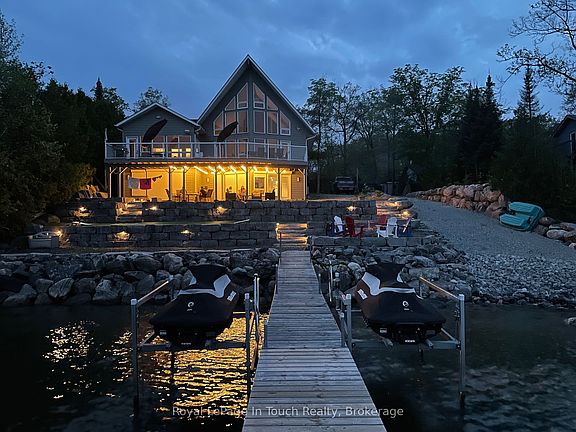 Custom Built Georgian Bay Waterfront Home boasting an incredible view across to Mini Cognashene and Smooth Island, offering more than 4500 square feet of living space, large sun deck on the water side, covered porch, quiet location, stunning views, fully finished walkout basement, circular drive, back up generator, your very own boat launch, 3 bedrooms with a Main Floor Primary Bdrm, 2 additional private rooms, 3 full baths, beautiful 2 storey stone fireplace, main floor laundry, hard wood floors, forced air gas heat, central air conditioning, dining area with walkout to deck, stainless appliances, & breakfast bar. Paradise awaits, put 201 Sawlog Point Rd on your wish list!