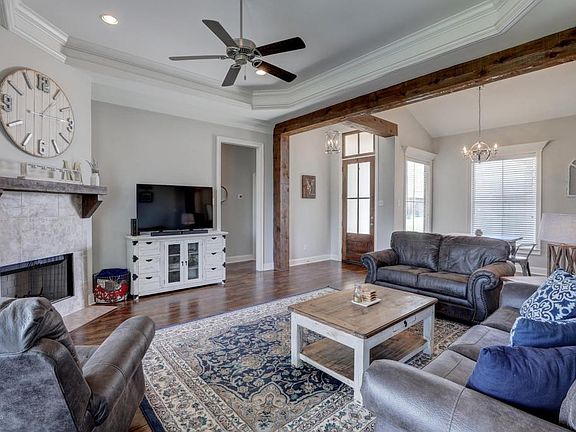Lovely, deep crown moldings, antique beams, step-up ceilings and a host of other amenities await the new owner of this beautiful home in Sawgrass, Phase II. All rooms boast wood laminate or tile flooring. With a split floor plan, the owners suite has a delightful barn-style door leading to its bath and large walk-in closet. A custom tile shower awaits, as well as a soaking tub and dual lavatories. The kitchen has gleaming stainless appliances, and granite counter tops. Two additional bedrooms and a bath complete this beautiful home. Reserved: Washer, dryer, refrigerator. All Relocation documents must be signed. Seller will be Halliburton Relocation Services. Please allow a minimum, of 45 minutes for showing to remove a small pet