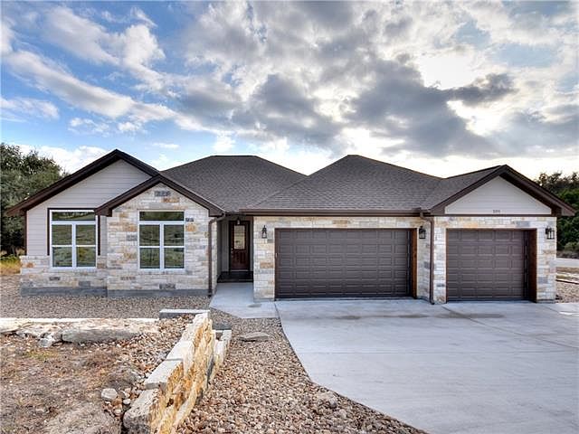 Looking for that OVERSIZED garage attached to the perfect sized house? Look no further...This 3/2/3+ is perfect for the cozy lake community of Point Venture, where it is located. The 3rd bay of this garage is 30' long and has a rear door, as well. The living area has easy to care for stained concrete floors throughout, crisp and bright white cabinets, and walk in closets in every room. Only lived in for a little over a year, its owners are relocating. Comes with comprehensive warranty pkg~see docs!! 24 hour showing notice requested.