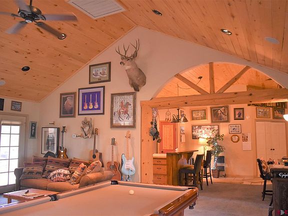 This is mountain living!! Like walking into a wooded cabin with an open floor plan, inviting kitchen with a large center butcher block bordered by a bar to sit and be a spectator for your own specialized cook off, or just to admire the scenery outside the kitchen window, no matter what season!! There are 2 bedrooms upon entering the home, to the right off the main hallway that leads to the master bedroom where the bathroom is equipped with a steam shower!! This custom built home had energy saving in mind with the installation of the corrugated metal ceiling, where it is designed to keep heat in during snow season, and the room cool for warm summers. This home includes an additional family room, also known as the game room as it has a pool table which will be left by Seller, in the second bathroom, there is also a jacuzzi tub to just soak it all in as a mountain retreat!! This property is within the PLPOA which grants access to fishing the lakes within PLPOA and Rec Center amenities with a small fee. Home is on a double lot.