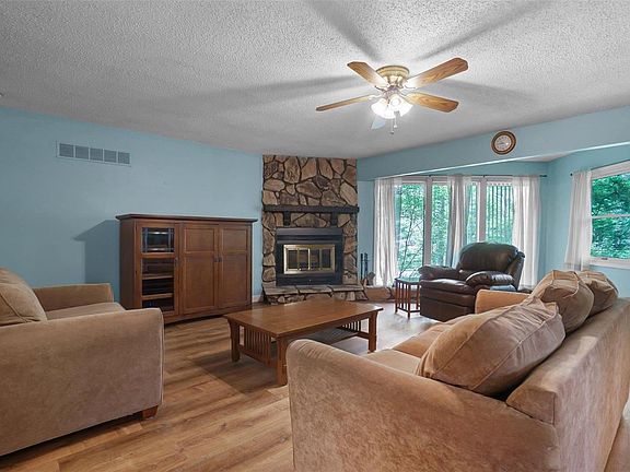 Welcome home to 201 Towerwood Drive. A unique home tucked among mature trees. Newer laminate flooring through out most of the main level. Beautiful wood burning fireplace. Open floor plan includes living room, dining room, breakfast room and kitchen with a pantry. Spacious primary bedroom can accommodate large furniture with attached walk in closet and private full bath. Main floor laundry room makes this a perfect home for those looking for one level living. Walk out to large deck that overlooks backyard. Lower level features a large family room and 2 additional bedrooms and second full bath. Additional room, with all the set up for a photography dark room, could be used as a craft room or even more storage. Large outbuilding with overhead garage door for keeping all your yard and gardening tools, large toys or just place to tinker. 2 car attached garage completes this home.