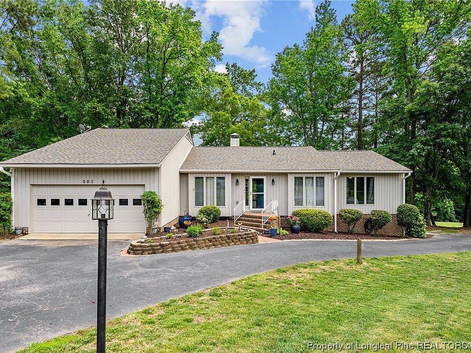 You will love this charming, updated, modern 4 bedroom 2 bathroom home in the desirable Carolina Trace. This house features a panoramic view filled with natural light that opens to the kitchen and breakfast area. The kitchen has custom cabinets, quartz countertops, tile backsplash, and stainless steel appliances. The large master and guest rooms can comfortably accommodate a king-size bed; check out the well-organized, customary walk-in closet that provides excellent functionality and efficiency. Some recent (2023) updates include new fixtures, fresh paint (ceiling and walls), a new roof (50-year warranty shingle), siding door, skylights, Roman shades in the kitchen, and a new water filtration system for the entire house. Hardwood floors are custom stained and the carpet was replaced in 2021. The tankless water heater and dehumidifier can be found in the walk-in crawl space. The foundation of the deck was replaced with TREX decking (2023). Come see this beauty for yourself.