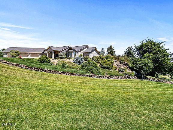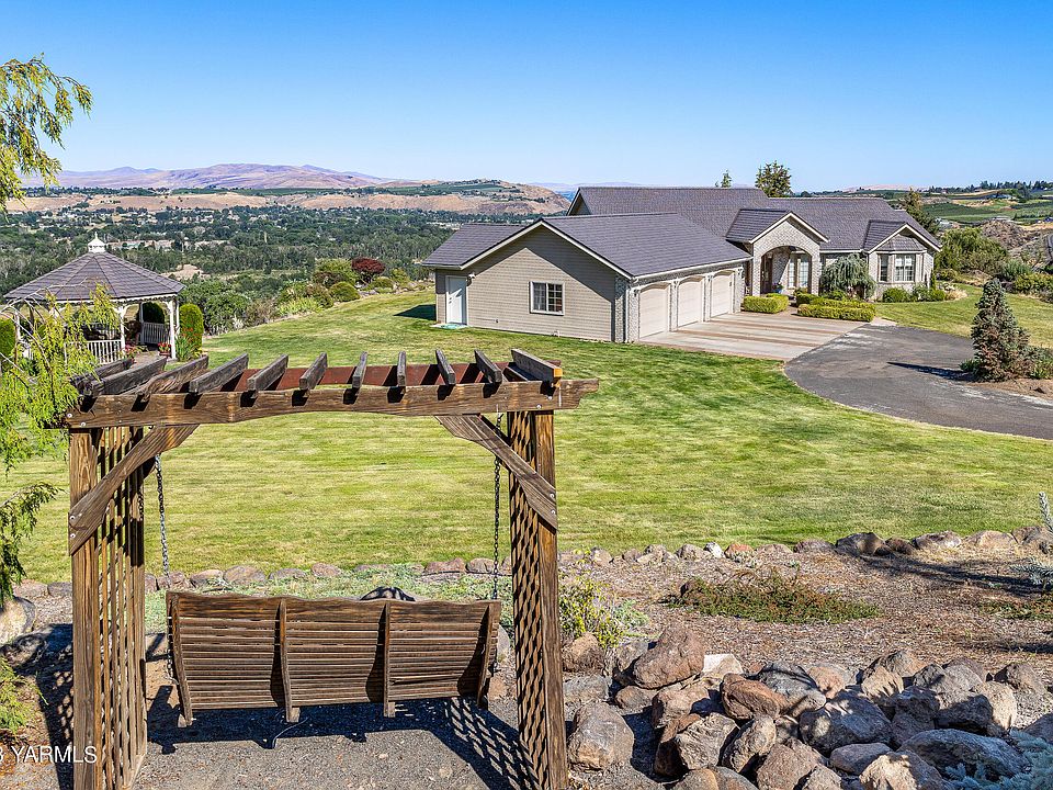 This is not your run of the mill home with a view. 201 Trails End Lane is secluded, at the end of a private drive atop 2.5 park-like acres w/ perennial flowers, natural grasses, trees, water features, thoughtfully placed benches and a 16' wide gazebo designed for sipping lavender lemonade and 'taking in the view'. An in ground sprinkler system and Sr. irrigation shares make it easy to maintain for self proclaimed 'green thumbs' or aspiring ones. The dramatic view below the basalt includes the Naches River winding along and the lower Naches valley, all the way through the gap to Yakima. No matter the time of year, this is one of the best views you can buy! Yet this home isn't all about the view and the grounds - inside it's just as beautiful! Built in 1995 and updated throughout in the last 2 years and voted as the People's Choice Award in the Central Washington Homebuilder's Association Tour of Homes. One simple step at the entry and the rest is one level living. As you enter this home the office is just to your right with the open concept living space just beyond the entryway. The living room, kitchen and dining area feature engineered hard wood flooring; Starmark cabinets with soft-close drawers; new appliances including double ovens, and a giant island with quartz countertops and seating for 6. A linear fireplace with a cherry wood surround and arched French doors constructed of cherry wood on the bonus room are adjacent. Make it your craft/homeschool room or wine bar. This home has a large primary suite which includes a brand new updated bathroom, and two additional bedrooms, one of which is currently being used as a TV room. Features not obvious but worth noting include an Enviroshake roof, updated windows, outdoor electrical receptacles, a new well pump, 2 hot water tanks and 240 volt receptacle for RV hookup along with a 3 car garage. Space for building a shop would be on the east side of the lower driveway. Much more to see so book your appt today!