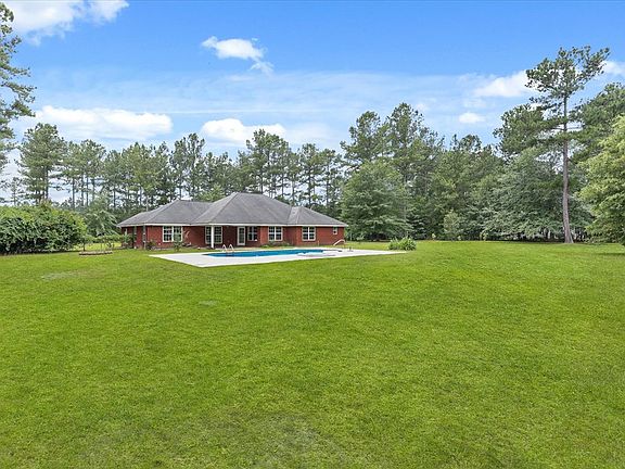 Welcome to your serene retreat! Nestled on 6.79 cleared acres, this charming all-brick home features a private driveway leading to open acreage. Step inside to a welcoming living room, with the dining room to the left. To the right, discover the master bedroom with an en-suite bathroom. Beyond the dining room lies a spacious kitchen and cozy breakfast nook, perfect for morning coffee. The open floor plan flows seamlessly, guiding you down the hall to three additional bedrooms and a second bathroom. The backyard is an oasis, boasting a covered patio and an inviting in-ground pool. This home offers comfort and tranquility, great for entertaining. Don't miss out on this perfect blend of privacy and convenience!